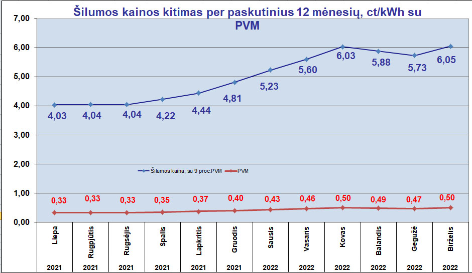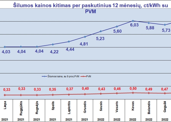 Gyventojams šilumos vienanarė kaina už suvartotą šilumos kiekį – 6,05 ct/kWh su 9 proc. PVM (5,55 ct/kWh be PVM)